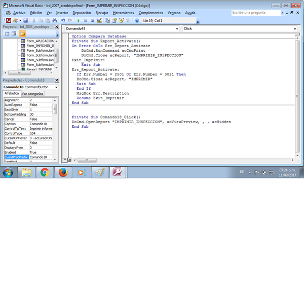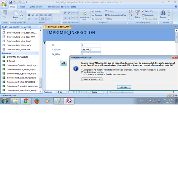 El formulario de nombre (aplicación) que contiene un cuadro de texto de nombre cedula es numérico y un informe (imprimir_inspeccion) necesito que al momento de colocar la cedula en el cuadro del formulario me busque en el informe todos los datos que contenga el informe y luego pueda guardar en formato pdf.