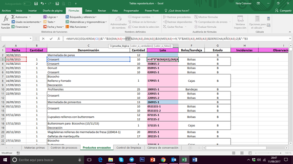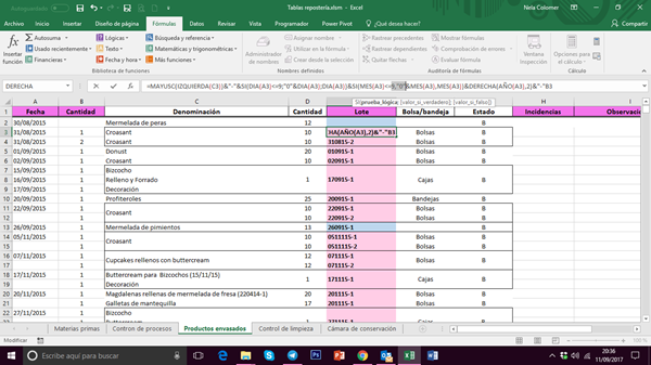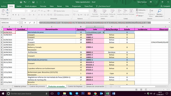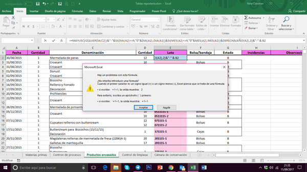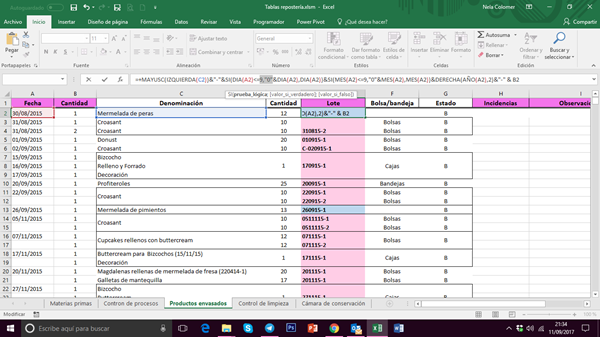 Tengo esta tabla y me gustaría que me saliera el lote de manera automática. El lote es un código compuesto por la primera letra del producto, la fecha de elaboración seguido de un numero que significa las veces que he hecho ese producto en ese día. Si hubiera echo dos masas de donust el mismo día, seria un 1 para la primera y un 2 para la segunda.