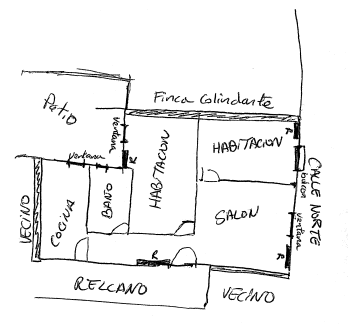 Buenas, este es el plano de la casa , perdón por lo artesanal, espero que sea claro. La casa está orientada al norte por la cara de la fachada exterior y al sur por la que da al patio. El grosor del muro, hasta la ventana son 26 cm. A los vecinos de la finca de al lado se oyen a la perfección y el tabique que separa mi casa con la del vecino, creo que el grosor es el de un ladrillo. El vecino que da con la cocina apenas esta igual que el de arriba que esta de vez en cuando asi como el de la finca del al lado. El unico que esta de manera continua es el que da con el comedor.