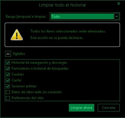 ¿Por qué no veo la opción LIMPIAR datos almacenados en Mozilla Firefox?