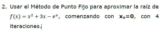 Usar el Método de Punto Fijo para aproximar la raíz de?(?) = ?2 + 3? − ?, comenzando con xo=0, con 4iteraciones.