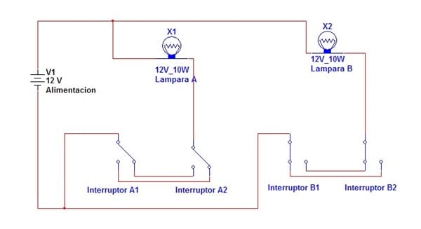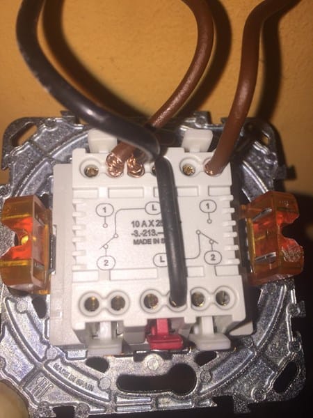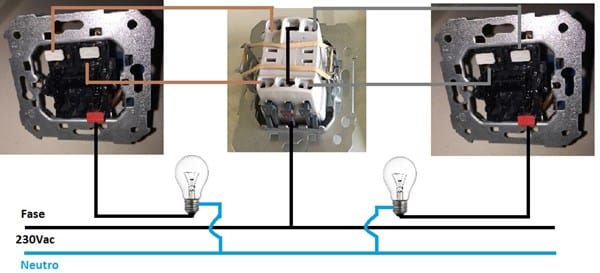 Cuando entro a casa tengo 1 interruptor que enciendo la primera parte del pasillo. En el centro del pasillo esta este interruptor doble que puedo apagar/encender la primera luz y el segundo interruptor sirve para encender o apagar la segunda luz del pasillo. Y luego hay un tercer interruptor a el final de el pasillo