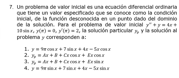 - Un problema de valor inicial es una ecuación diferencial ordinaria que tiene un valor especificado que se conoce como la condición inicial, de la función desconocida en un punto dado del dominio de la solución. Para el problema de valor inicial y" + y =4x + 10 sin x, y(π )=0, y`(π )=2 , la solución particular yp y la solución al problema corresponden a: