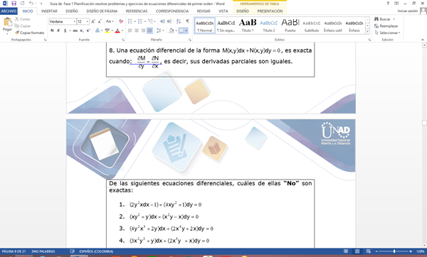 Una ecuación diferencial de la forma M (x, y)dx + N(x, y)dy=0, es exacta cuando: aM/ay =aN/ax , es decir, sus derivadas parciales son iguales.