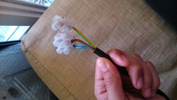 A una clavija (schuko), para hacer la conexión por enchufe, ya que éste está a más de medio metro por encima del horno y no es plan desmontar el enchufe y conectar cable con cable, queda demasiado expuesto, además nos da la posibilidad de enchufar el horno y desenchufarlo cuando no lo usemos.