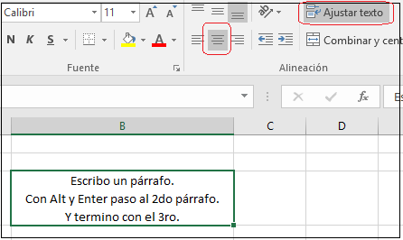 En una misma celda, para escribir varios párrafos centrados ¿cómo se se hace?