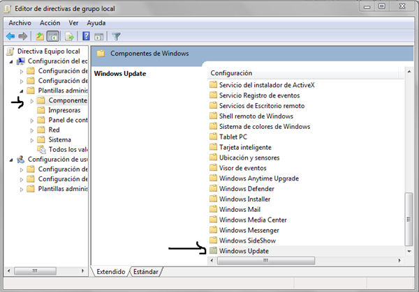 Ahora tenemos que navegar lo siguiente directiva local>platillas administrativas>componentes de windows=windows update