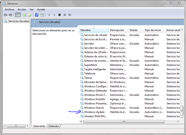 abrimos y nos vamos al fondo de la lista buscando el servicios de windows update