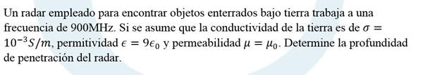 Un radar empleado para encontrar objetos enterrados bajo tierra trabaja a una frecuencia de 900MHz. Si se asume que la conductividad de la tierra es de, permitividad y permeabilidad . Determine la profundidad de penetración del radar.