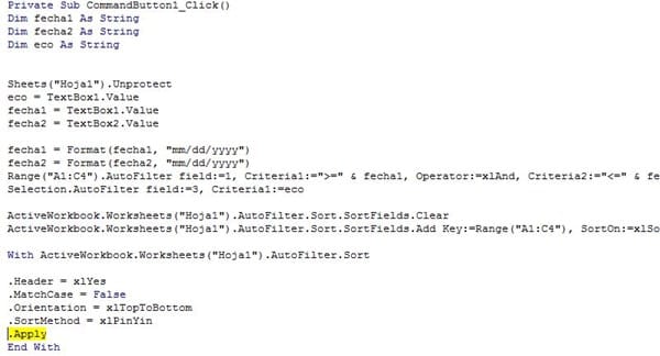 Quiero filtrar un rango de fechas dependiendo de un criterio en TextBox, tengo un código que compartió Dante y lo estoy tratando de acoplar, esta es la pantalla: