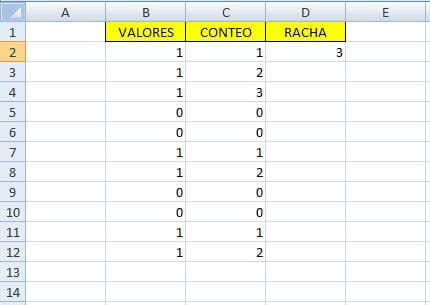 Quiero contar las veces que se repite una racha en una columna. Tengo en mi columna B, así:
