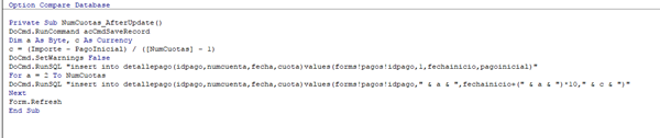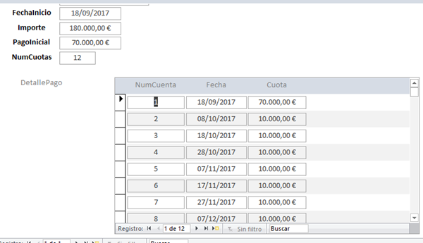Lo que quiero hacer es que cuando digite el numero de cuotas, cree automáticamente las filas con las respectivas fechas y pagos. Ejemplo