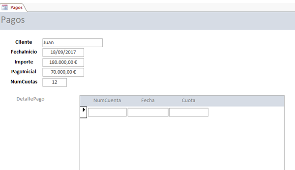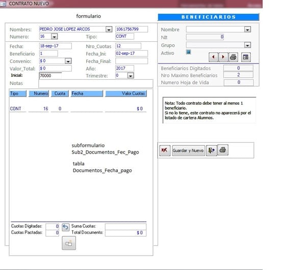 Tengo un formulario con varios subformularios una llamado contrato el cual cuando digito el numero de documento me muestra el nombre de la persona, el numero de documento y la fecha de creación del contrato, el otro ingresa el numero de cuotas pactadas, la fecha de inicio de los pagos y la fecha que termina el pago.