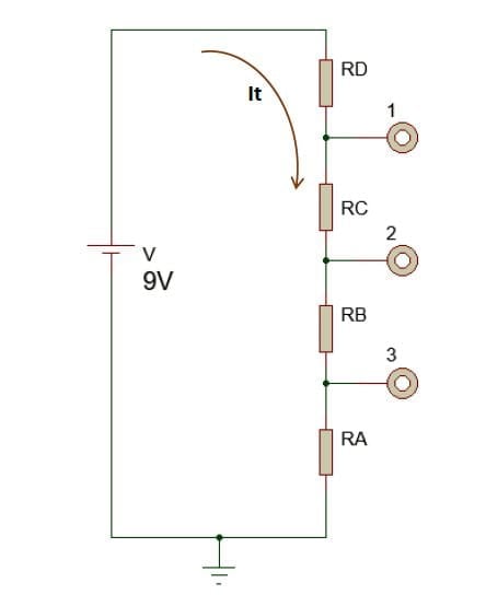Podría SUPONER que las cuatro resistencias son iguales entre si y de 2,5 K cada una: De esa forma, un divisor resistivo de cuatro resistencias iguales, me hace que los escalones de tensión sean iguales, y "divididos en cuatro" (9 dividido 4, serian 2,25 voltios por escalón), Así en el punto 3 la tensión seria 2,25 V, en el 2 el doble 4,5 V, en el tres el TRIPLE (Tal como pide el enunciado), y 6,75 V...