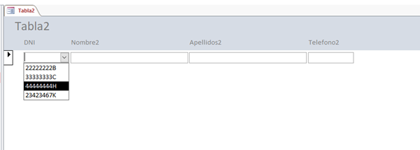 Telefono2 = DLookup("telefono1", "tabla1", "dni='" & Me.DNI & "'")