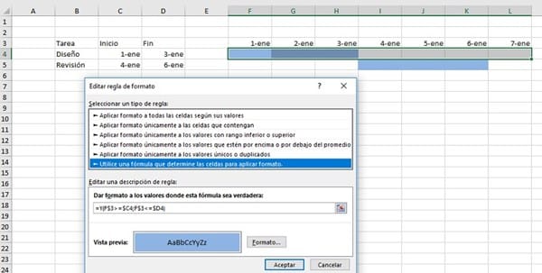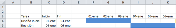 Tratando de simular un diagrama de gantt, en las columnas tengo, como encabezado, distintas fechas (1-1, 2-1,3-1,4-1...) y en las filas diferentes tareas (diseño inicial, revisión...) con diferentes fechas de inicio y fin (diseño inicial; inicio: 1-1; final: 3-1). Con estos datos me gustaría que se sombreasen automáticamente las celdas comprendidas entre ambas fechas, en la fila de la tarea específica.