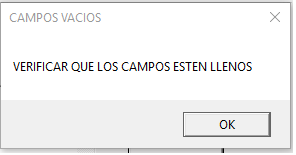MsgBox "VERIFICAR QUE LOS CAMPOS ESTEN LLENOS", vbOKOnly, "CAMPOS VACIOS"
