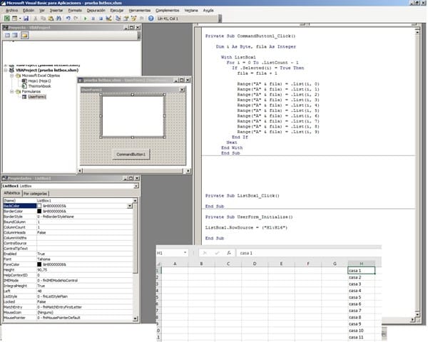 Private Sub CommandButton1_Click() Dim i As Byte, fila As Integer With ListBox1 For i = 0 To .ListCount - 1 If .Selected(i) = True Then fila = fila + 1 Range("A" & fila) = .List(i, 0) Range("A" & fila) = .List(i, 1) Range("A" & fila) = .List(i, 2) Range("A" & fila) = .List(i, 3) Range("A" & fila) = .List(i, 4) Range("A" & fila) = .List(i, 5) Range("A" & fila) = .List(i, 6) Range("A" & fila) = .List(i, 7) Range("A" & fila) = .List(i, 8) Range("A" & fila) = .List(i, 9) End If Next End With End Sub Private Sub UserForm_Initialize() ListBox1.RowSource = ("H1:H16") End Sub
