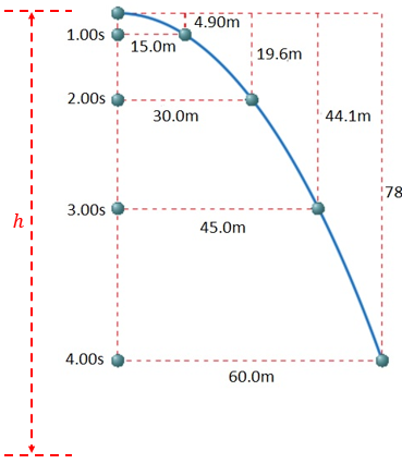 Para ello toma dos masas iguales y las ubica a una misma altura “h”. Una de las masas se suelta en caída libre y, simultáneamente, se lanza la otra masa horizontalmente con una velocidad inicial “Vo”. Durante los primeros 4 segundos, las distancias vertical y horizontal alcanzadas por cada masa, se muestran en la siguiente figura (NOTA: Trabaje el módulo de la aceleración gravitatoria como 9.8 m/s2):
