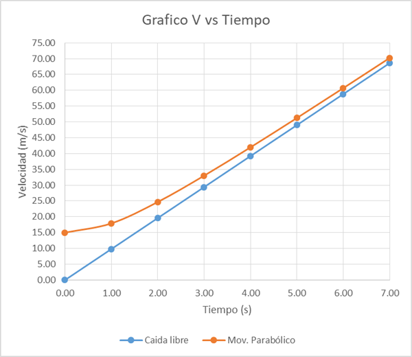 i. Elabore una tabla donde coloque los datos de velocidad V para cada tiempo t desde t=0.0 s a t=7.00 s, llenando una columna para cada masa. Luego realice una gráfica de velocidad V contra tiempo t, superponiendo los dos movimientos (dos gráficas en un mismo plano cartesiano, distinguidas por color y/o tipo de línea)