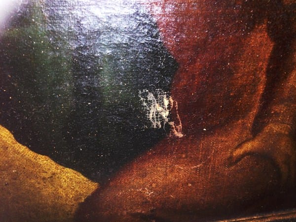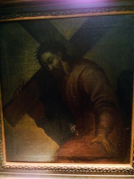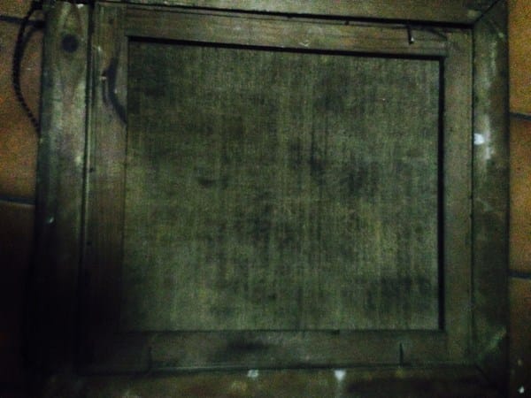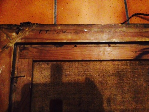 SE trata de un oleo anónimo, pintado sobre tela con unas dimensiones de 40 x 44 cms. Como curiosidad, y aunque no sea significativo, puedo indicar que la obra fue regalada por un noble de Mallorca tal y como consta en la inscripción posterior (apenas legible en parte) en 1894 y que tal y como puede verse en la foto, sufre algún pequeño desperfecto.