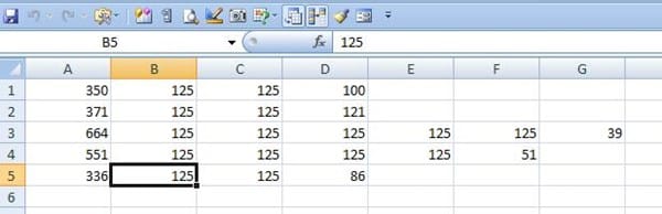 Necesito repartir el valor de una celda y que me lo devuelva en la columna siguiente en tantas filas como sea necesario en fracciones de 125 unidades y la ultima con el resto. Es decir si el valor de F5 es 350 unidades necesito que me devuelva G5 125 unidades, G6 125 unidades y G7 100 unidades.