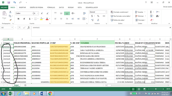 Hoja 1 con datos de la columna A a la columna Z con unos 3000 registros