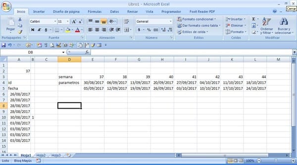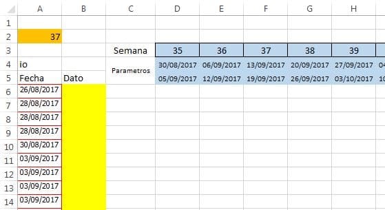 Lo que deseo es que en la celda "A2", poner la semana y que la busque en la fila 3, luego de encontrarla que compare las fechas de la columna "B" con las 2 celdas inferiores a la semana ya encontrada " parametros" si está dentro de estos en la columna B al costado de la fecha que se ponga 1, si no es así que no se ponga nada y continue con la siguiente celda de la columna B.