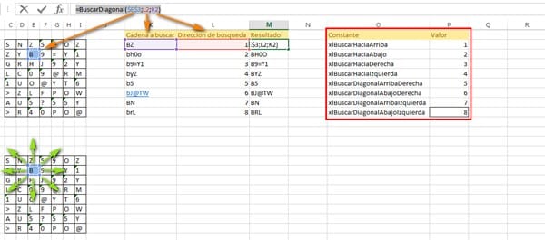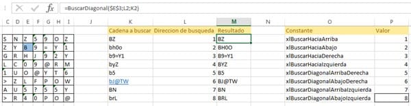 BuscarDiagonal(<Referencia a la celda desde donde queremos buscar>, <Direccion de busqueda>, <Cadena a buscar>)