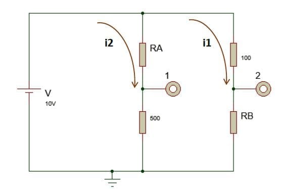 Para el siguiente circuito empleado para realizar la conexión de un sensor, determine los valores de Ra y Rb para garantizar que en los terminales 1 y 2 exista el mismo voltaje y que la corriente en i1 no supere los 10mA.