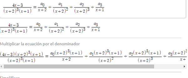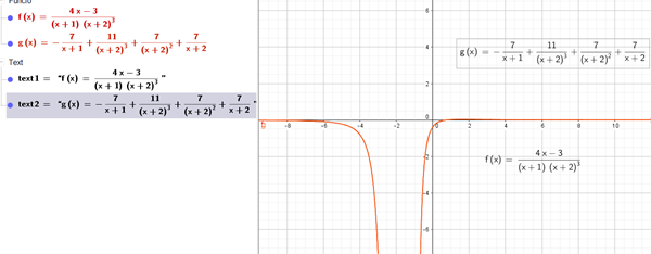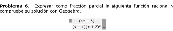 Expresar como fracción parcial la siguiente función racional y compruebe su solución con GeoGebra.
