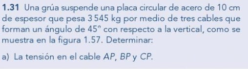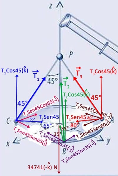 BP=T2 y AP=T3. También el vector PESO = W(-k) donde W=3545(9.,8)=34741N