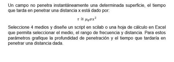 Hallar el rango de frecuencia y distancia. Para estos parámetros grafique la profundidad de penetración y el tiempo que tardaría