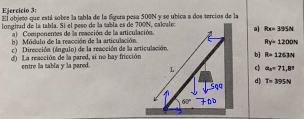 Ejercicio. Muchas gracias. Yo pude calcular la reacción de la pared que me dió 375N. Se me dificulta para calcular los componentes de rx y ry y los ángulos. ¿En las rx yo no tendría en cuenta la de los peso ya que sería seno de 270°?
