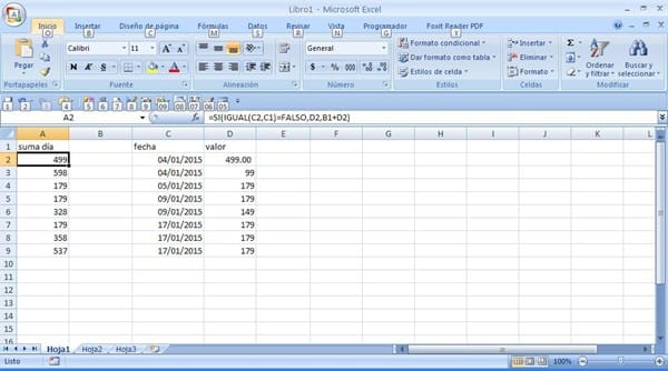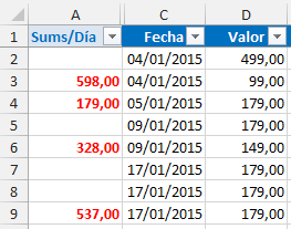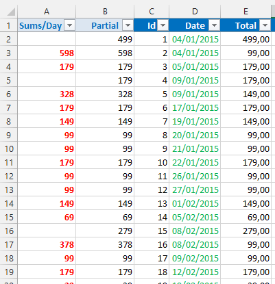 Los valores que aparecen en rojo son los que tendrían que resultar (yo los he puesto aquí a mano). Por ejemplo, el día 4.1.15 arroja un valor de 598 (499+99), el 5.1.15 de 179 (solo un sumando) o el 17.1.15 de 537 (179+179+179)