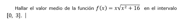 $$\begin{align}&\overline{f(x)} = \frac{1}{b-a}\int_a^bf(x) dx\\&\text{En este caso}\\&\overline{f(x)} = \frac{1}{3-0}\int_0^3 x \sqrt{x^2+16} dx=\\&Sustitución\ u=x^2+16\\&du = 2xdx \to \frac{du}{2}=x dx\\&Retomando\\&\frac{1}{3}\int_0^3 \sqrt{u} \frac{du}{2}=\frac{1}{6}\int_0^3 \sqrt{u} \ du=\\&\frac{1}{6} \frac{u^{3/2}}{3/2}\bigg|_0^3 = \\&\frac{1}{9} (x^2+16)^{3/2}\bigg|_0^3 = \\&\frac{1}{9} \bigg((3^2+16)^{3/2}-(0+16)^{3/2}\bigg)=\\&\frac{1}{9} \bigg(25^{3/2}-16^{3/2}\bigg)=\\&\frac{1}{9} \bigg(125-64\bigg)=\frac{61}{9}\end{align}$$Salu2
