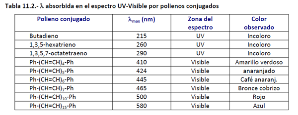 Esto es así por que las sustancias orgánicas con color, absorben en el visible, y para eso necesitan enlaces conjugados. Observa la tabla: