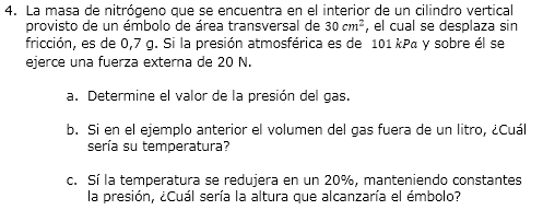 - La masa de nitrógeno que se encuentra en el interior de un cilindro vertical provisto de un émbolo de área transversal de 30 cm2, el cual se desplaza sin fricción, es de 0,7 g. Si la presión atmosférica es de 101 kPa y sobre él se ejerce una fuerza externa de 20 N.
