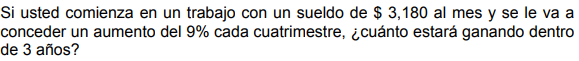 Ene-Feb-Mar-Abr (10 mo cuatrimestre) sueldo = 3180(1+0.09)^9 = 6906.620629