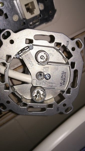 En una de las salidas del alimentador he enchufado un mezclador SAT/tdt (http://www.leroymerlin.es/fp/16026920/mezclador-para-senales-de-tv-y-de-satelite-evology- ) donde he conectado el cable de la parabólica y uno de los que salen del alimentador. Y en la salida del mezclador el que baja a la vivienda. En el enchufe de la antena he cambiado la vieja toma por una sat (http://www.leroymerlin.es/fp/14805770/toma-de-tv-intermedia-simon-27 ).