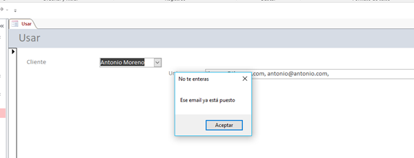 Tengo un formulario en donde realizo la selección de nombres en un cuadro combinado. A partir de esa selección me agrupa los correos electrónicos de cada nombre que voy seleccionando. El problema que si ya fue seleccionado un nombre, me sigue agrupando el correo en el campo destinado para almacenar las direcciones de correos electrónicos.