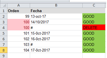 Estás serían mis instrucciones: Busca los valores repetidos en la columna A, si encuentra repetidos, ahora busca en la columna B, y si tiene el símbolo "#", elimina toda esa fila. Que se ejecute hasta haber recorrido todos los datos de la hoja de cálculo.