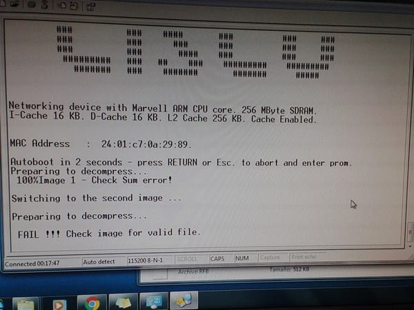 Tengo un SW Cisco sg-500-52 del cual al instalarle un firmware no inicia liza. He intentado resetearlo a balores de fabrica y no funciona, sale un error que en la imagen se evidencia.