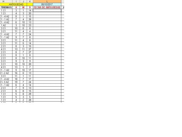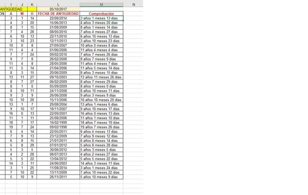 ¿Qué fórmula podría emplear para conocer la antigüedad de un trabajador que a fecha L1 lleva trabajando I3 años, J3 meses y K3 días?. El formato de salida debería ser DD/MM/AAAA