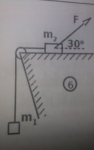 Los bloques de masas m1=m2=1kg están conectados por una cuerda ligera que pasa por una polea . Se aplica una fuerza de F=20N a m2, quien se desplaza sobre un plano horizontal rugoso.