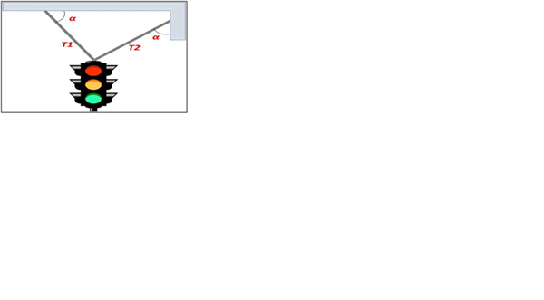 Un semáforo de 13,8 kg, está suspendido tal como se muestra en la figura, donde el ángulo tiene un valor de 57,7°. Respecto al sistema se necesita saber si la tensión del cable más inclinado T1 es mayor o menor que la del otro cable. Para ello realice el siguiente procedimiento: