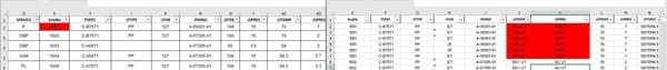 Necesito comparar la información de Linelist1 con la de Linelist2, que busque el numero de la columna E de Linelist1, (ejemplo 1001) en cada fila de la columna E de Linelist2 y colore en rojo los datos que no coincidan de las demás celdas de esa misma fila, la información termina hasta la columna AI.