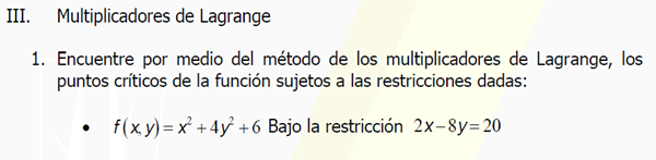 ∂/∂λ= 2x-8y-20; igualado a 0: 2x=20+8y; reemplazando: 2x=20-8x; x=2;