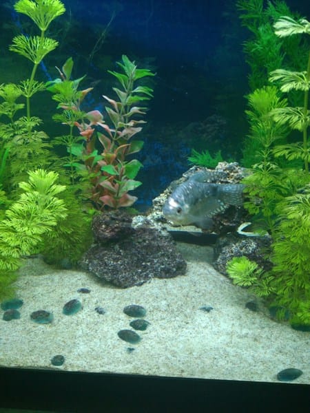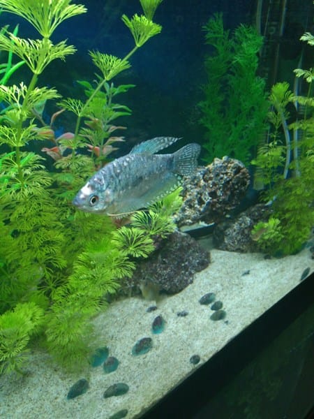 Mi Gurami parece ser que tiene una enfermedad (la cuál no he sabido identificar). Al principio, les salio como unas manchas blancas en la cabeza y las confundí con golpes en el cristal; pero no fue así. Las manchas blancas fueron aumentando hasta el punto de rodearle en el resto del cuerpo e incluso, poco a poco parecia caerse las escamas. Se creaban huecos profundos hasta el punto de unirse de un punto a otro alrededor de la cabeza y por ultimo, parece ser que en esos huecos tiene como hongos u otra masa extraña blanca...