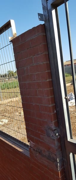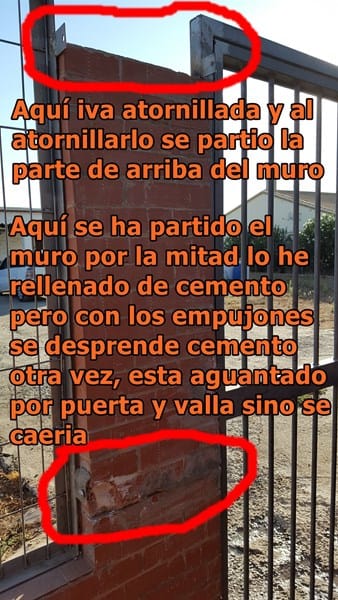 - El muro también se encuentra partido como comprobareis en la foto y va aguantado por la valla y puerta... ¿qué hacer para arreglarlo? ¿Habría qué tirar y otra vez poner ladrillos? Pero lo veo yo muy endeble al atornillar la parte de arriba se desprendieron los ladrillos de la parte de arriba igual que como esta el muro en la parte media y al final me soldaron una barra de acero directamente de la valla a la puerta en vez de atornilla en parte de arriba que no se podía pues se había caído.